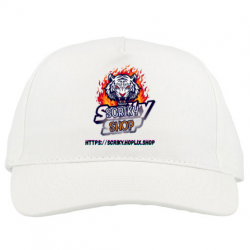 5-panel adult hat. Preformed visor with sandwich, 4 embroidered ventilation eyelets, adjustable back closure with metal buckle.